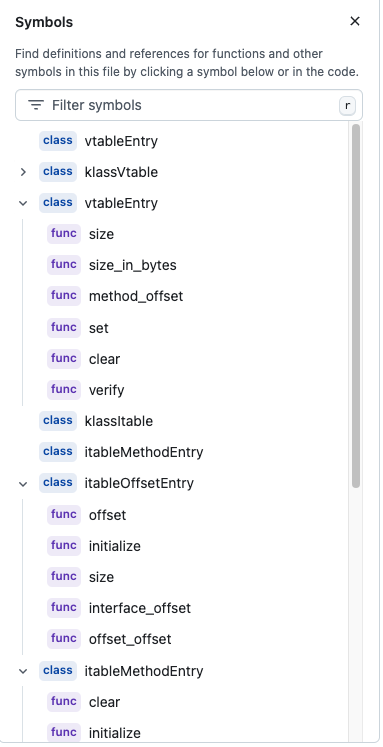 OpenJDK klassVtable.hpp에는 다음처럼 명시되어 있다. JVM이 가상 메서드 디스패치를 최적화하기 위해 사용하는 virtual method table이다. 클래스의 virtual methods에 대한 포인터가 저장된다. 각 클래스마다 고유한 vtable을 가진다. invokevirtual 바이트코드 명령어를 처리할 때 활용된다.
