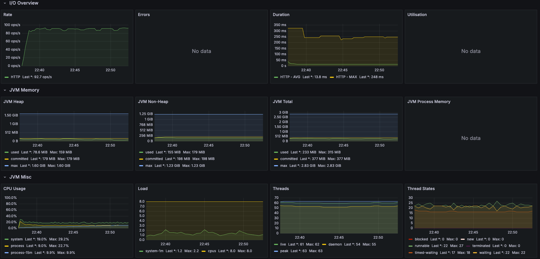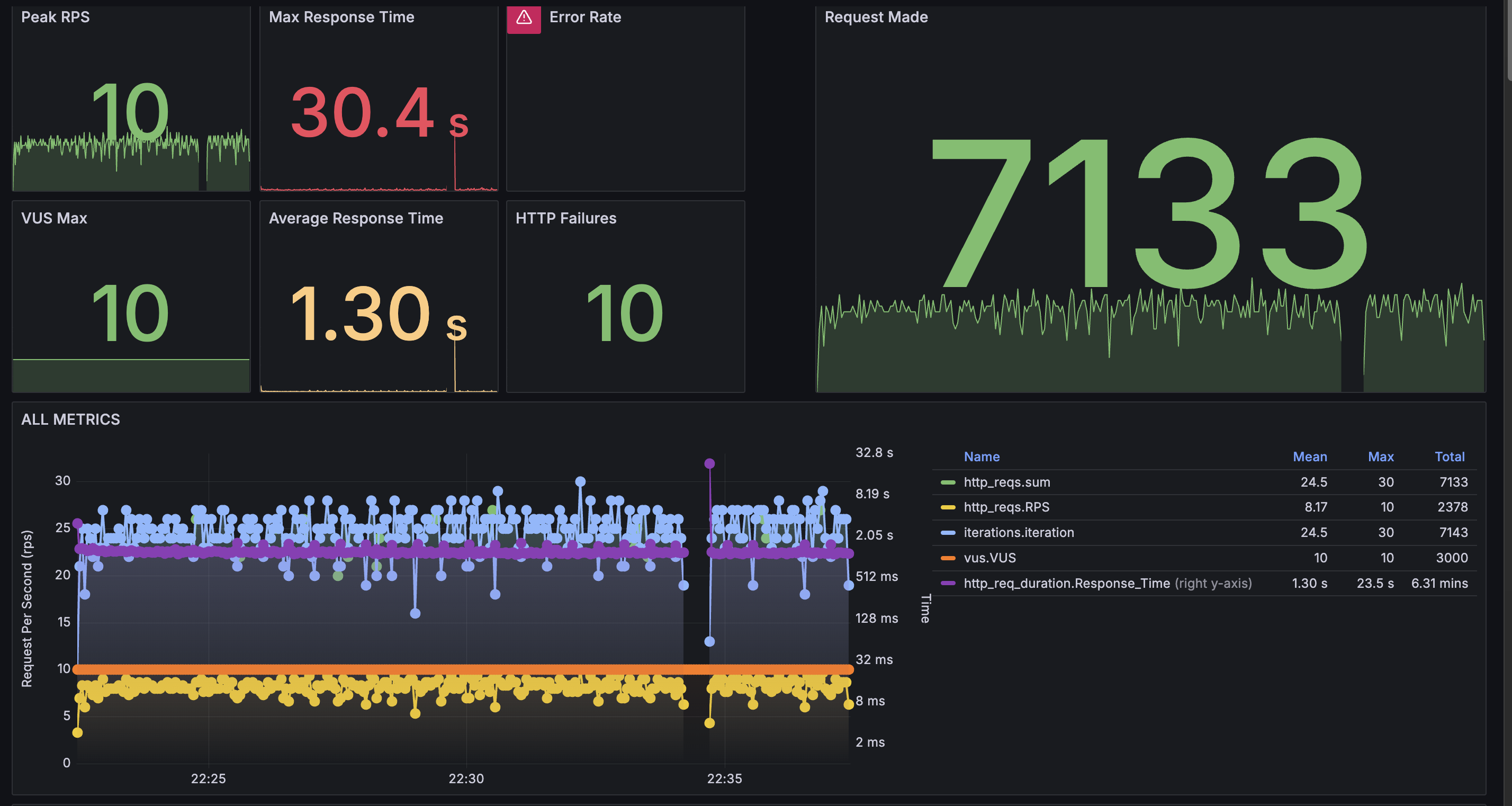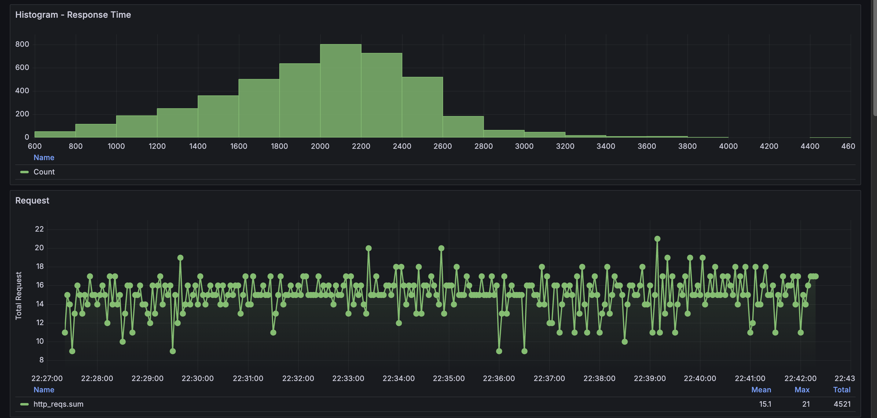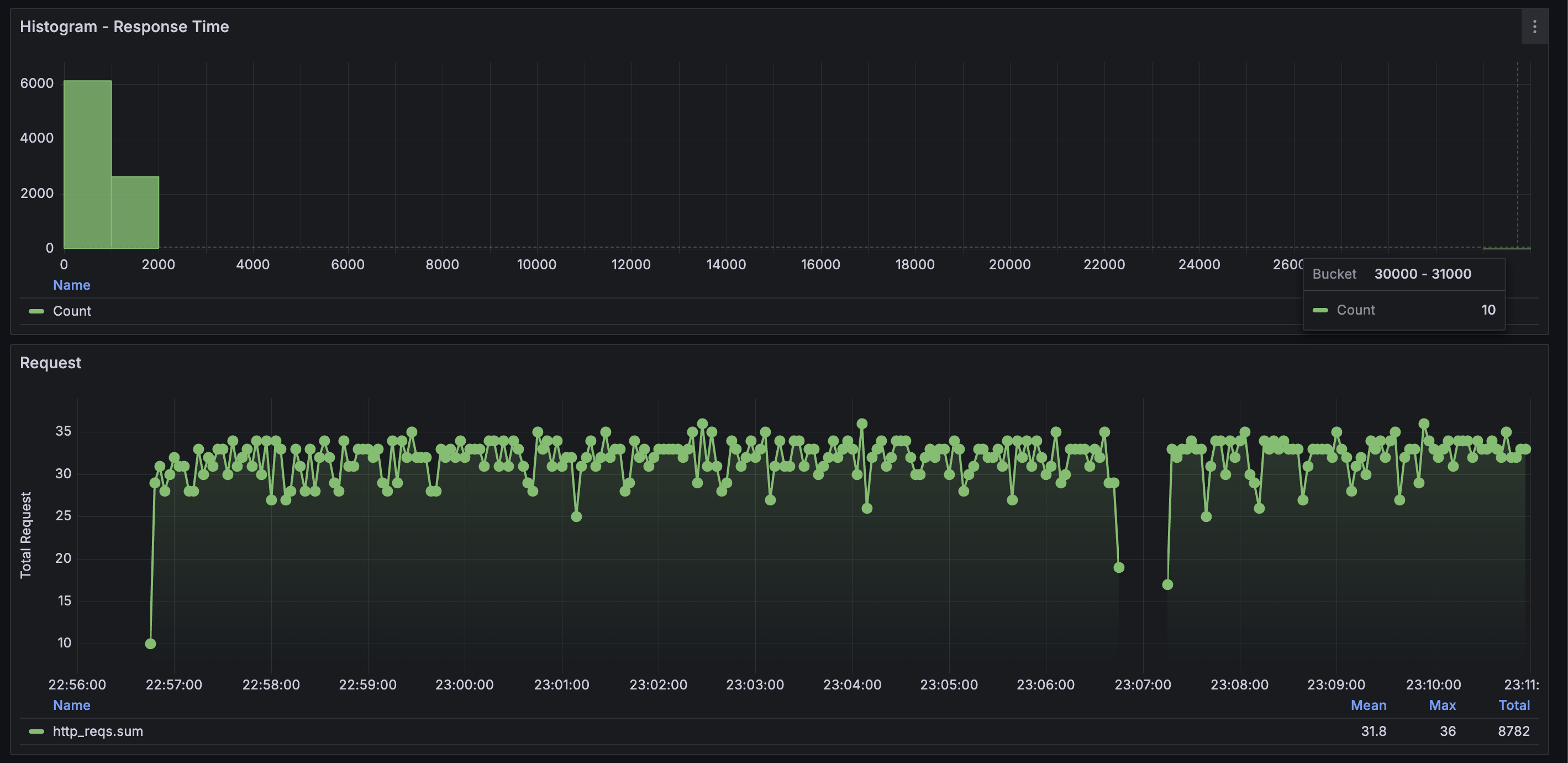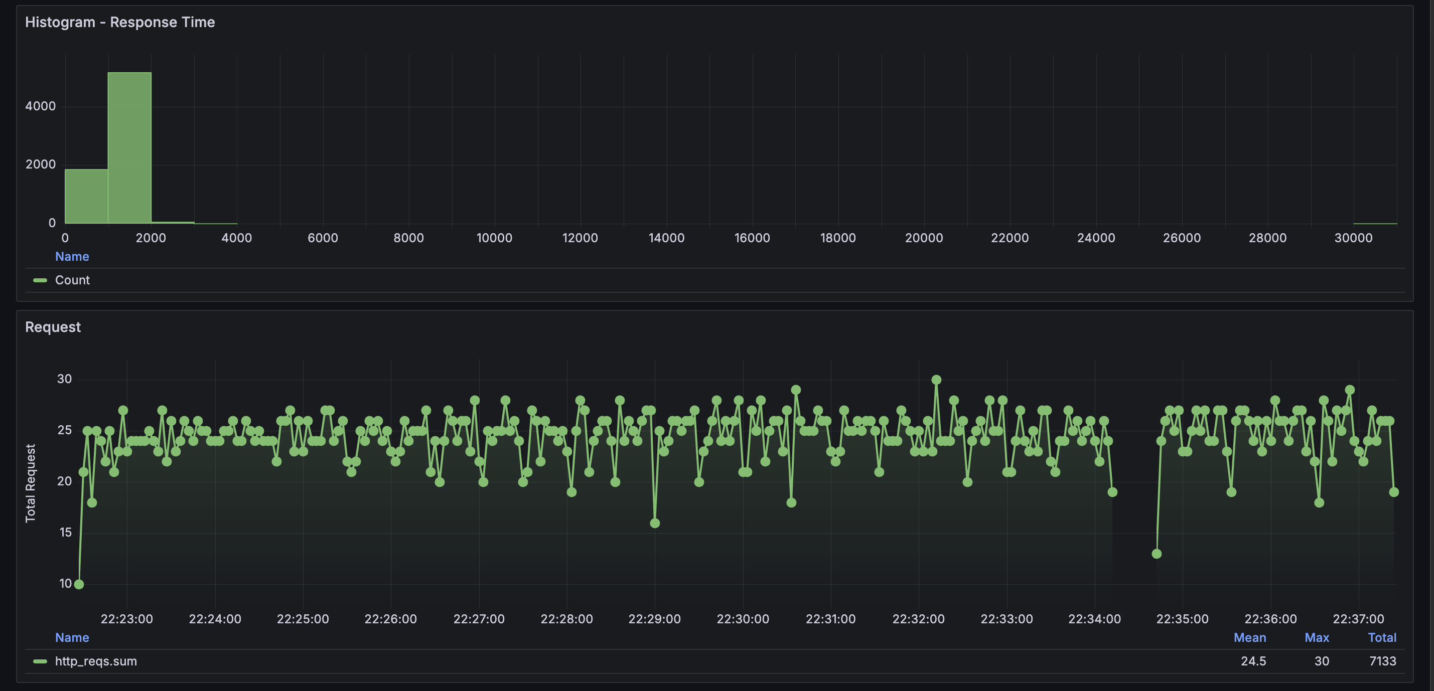 15분 동안 총 47.6K의 요청이 발생했고, 1개의 리퀘스트를 처리하는데 100 ~ 250ms가 소요되고 있다. 한편 부하 생성기에서는 초당 평균 54.8개의 요청을 만들어내고 있다. 8초면에 max_thread에 도달하고, 10초면 accept_count에 도달한다. 3~4분 정도 지나면 max_connections에 도달한다. 초당 4 ~ 10개의 요청을 처리하니까 max_connections 도달 시간이 조금씩 뒤로 밀리다가 결국 연결조차 못하고, K6 대시보드에서도 해당 구간의 그래프가 빈 것으로 보인다. 30초 타임아웃이 발생한 건 accept_count 에 들어가 대기 큐에 있긴 하지만, 처리량이 빠르지 않아 타임아웃이 발생한 듯 하다.