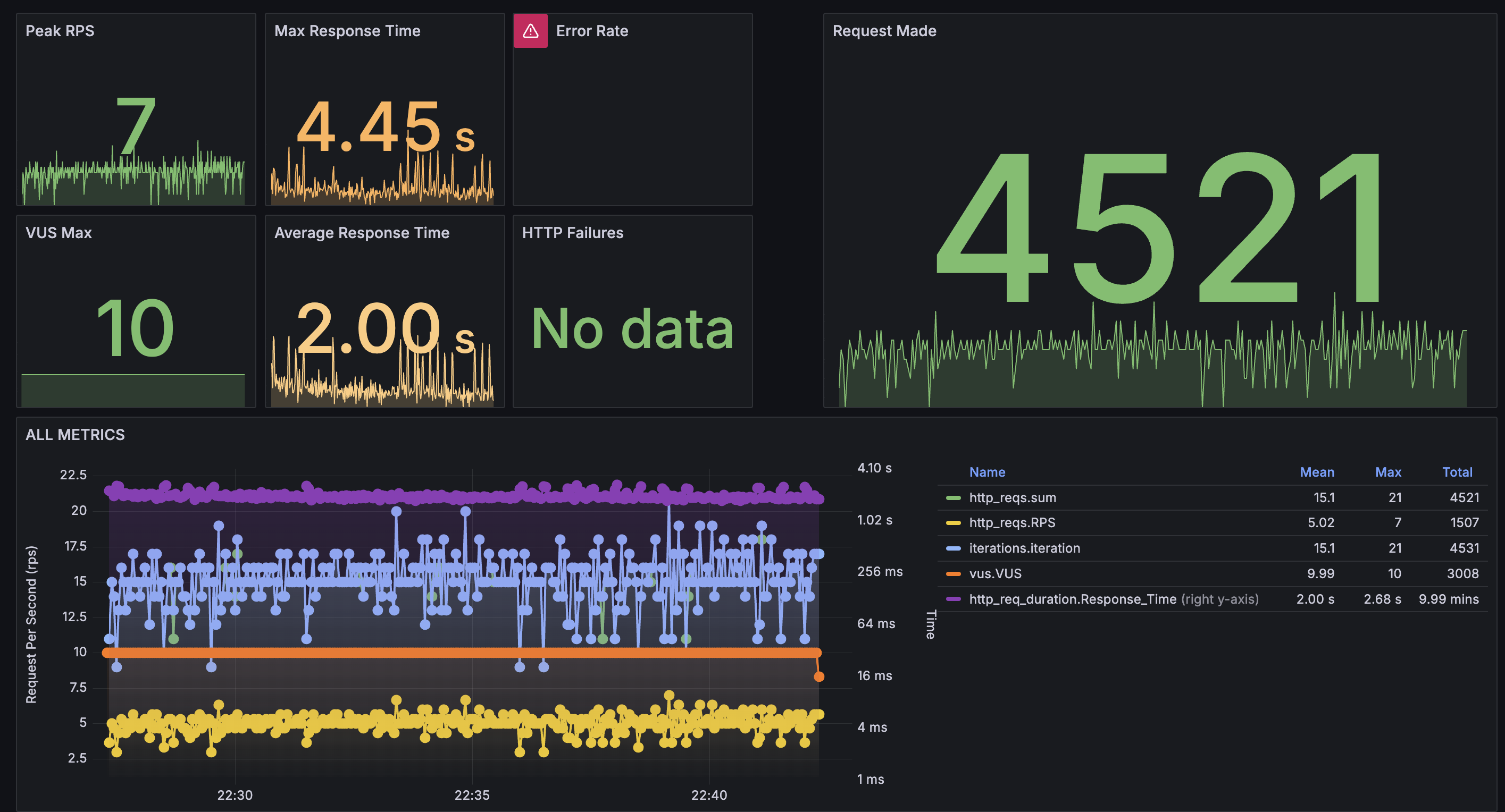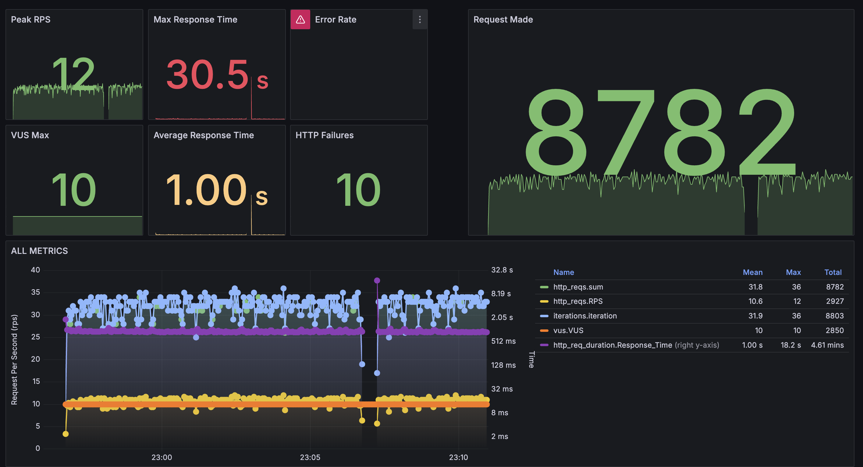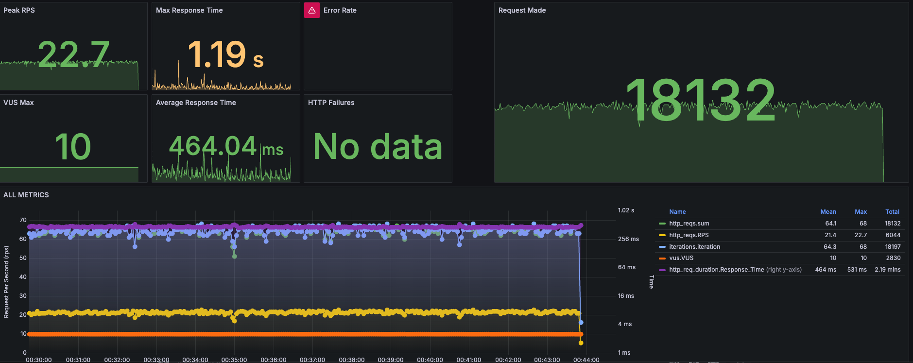 Request 처리 속도가 매우 느리다. 그리고 4RPS 로 찍히는 것으로 보아, 부하를 견디기 어려워하는 것 같다. 의외였던 것은 DB 쪽은 굉장히 빨랐다는 것이다.