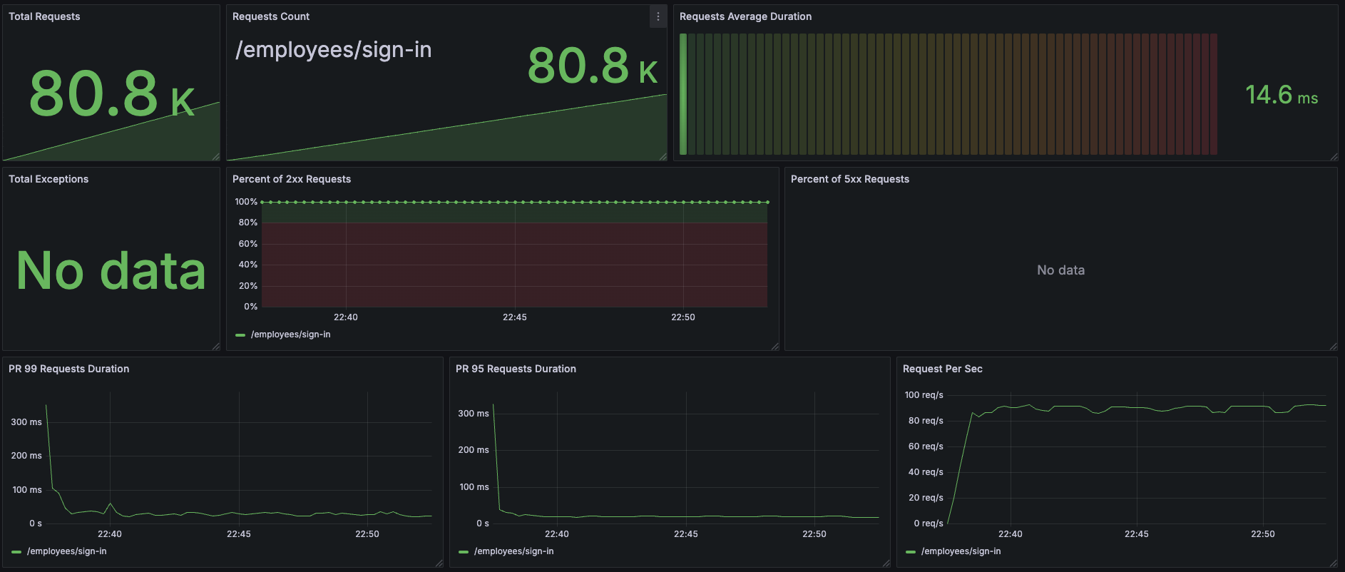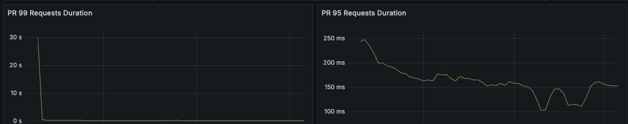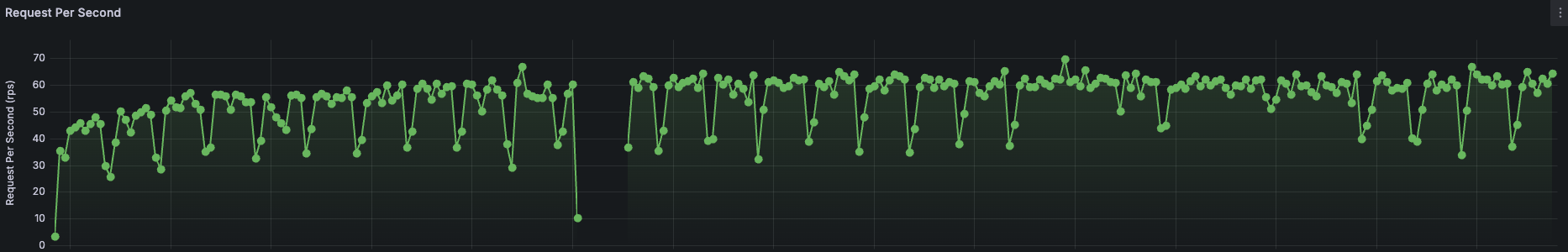 기존보다 요청량이 2배 가까이 늘었다. 그럼에도 불구하고 PR99 PR95 상으로는 요청 처리 속도가 많이 개선되었다. RPS도 2배 가까이 늘었다. 역시 돈은 좋다.