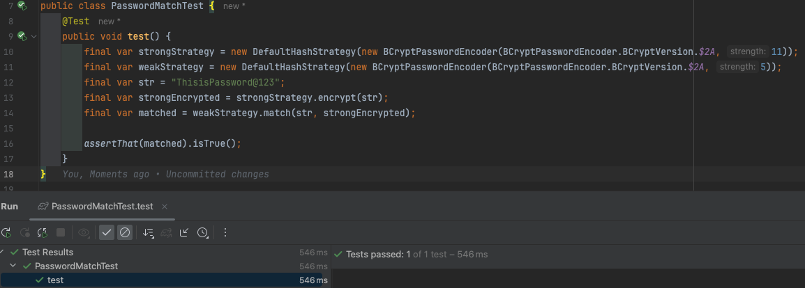 근데 BCrypt 알고리즘을 확인해보니까 해시 강도 정보는 해시 값에 포함되어 있기에, match() 함수를 쓸 때는 설정된 strength랑 상관 없이 해시 값의 해시 강도 정보를 사용한다. 따라서 초기 설정값이 굉장히 중요한 듯 했다. 다행히도 아래처럼 하면 강도를 바꾸면서 마이그레이션을 진행할 수 있다.
