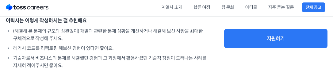 토스에 여러 번 지원하면서 내가 할 수 있는 온갖 형태의 이력서 및 경력기술서를 제출해보았다. 그 중 "요약된 이력서 (1~1.5장) + 자세한 업무기술서 (3장 이상)" 이 가장 좋은 결과를 얻었고, 주변에서도 제일 반응이 좋았다. (다른 분껀 11장?도 봄) 이력서가 너무 많은 장표를 가지고 있는 것 아니냐는 피드백도 몇 번 받았지만, 토스 SLASH 에서 만나뵌 채용 담당자님은 오히려 자세한 내용을 담아달라고 꼭 부탁하셨었다. 토스 채용 사이트에서도 기재되어 있는 내용이다.