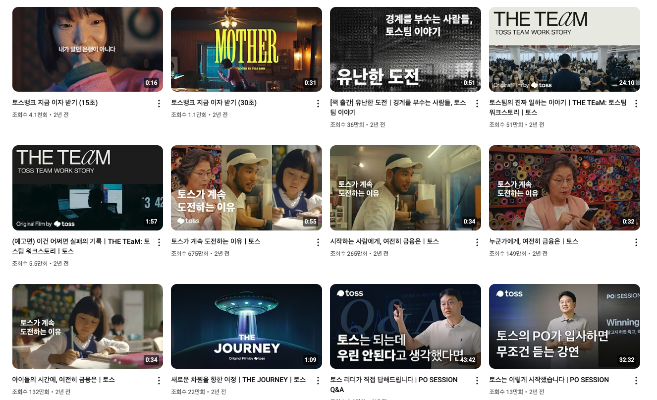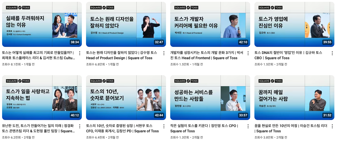 이 면접을 준비하기 위해서 토스 유튜브와 토스 피드를 많이 봤다. 특히 개발자 직군에만 한정돼서 본 것이 아니라 PO, PM, 디자이너 등 직군을 가리지 않고 정말 많이 보았다. 그러면서 영상들 썸네일에 있는 문구들에 대해서 스스로 질문을 던져보았다.