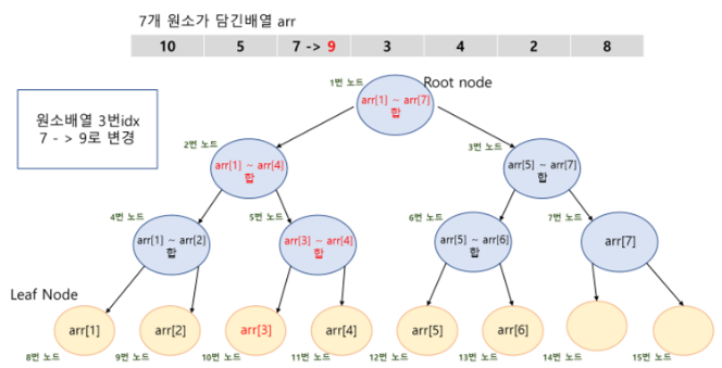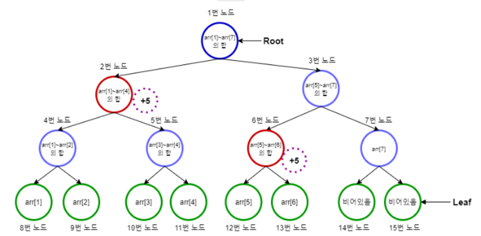 중간에 값이 변경되었을 경우, 재귀적으로 기존의 값과 현재 값의 차이만큼 영향 받는 모든 노드에 연산을 수행하여 변경해주는 방식