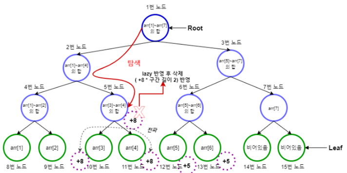 3을 더해서 업데이트해야하므로, 8만큼을 업데이트 한 뒤에 자식 노드에 lazy 를 전파시키는 방식으로 진행됨