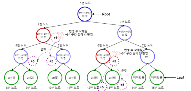 변경 구간의 대표노드 : 빨간색 / 대표노드의 lazy : 파란색