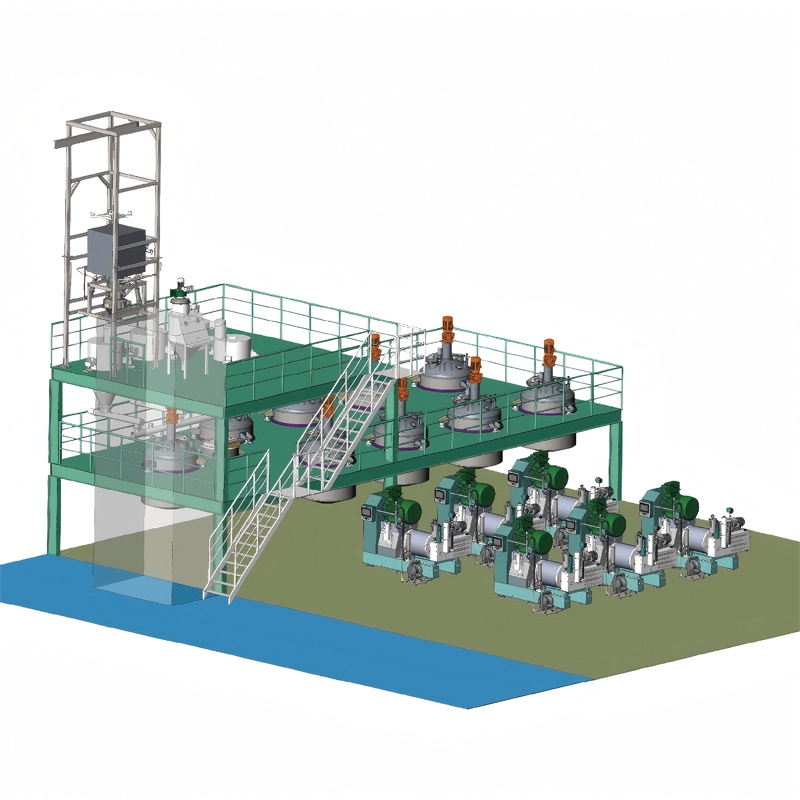 The anode material are dropped by gravity from the ton bag feeding station/dust-free feeding station and put into the metering bin through the iron remover. After precise weight loss measurement, the materials are fed into the premixing tank. After full stirring, the material enters the bead mill. After coarse grinding and dispersion, fine grinding and dispersion are carried out before demagnetization.