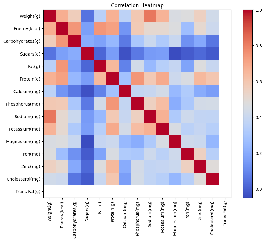 df.columns = ['Food Name', 'Weight(g)', 'Energy(kcal)', 'Carbohydrates(g)', 'Sugars(g)', 'Fat(g)', 'Protein(g)', 'Calcium(mg)', 'Phosphorus(mg)', 'Sodium(mg)', 'Potassium(mg)', 'Magnesium(mg)', 'Iron(mg)', 'Zinc(mg)', 'Cholesterol(mg)', 'Trans Fat(g)']