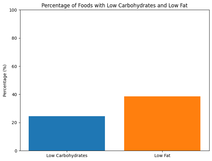 # Calculate the percentage of foods with low carbohydrates and low fats