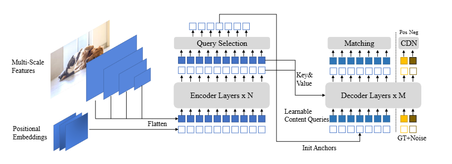 DINO는 DETR계열의 end-to-end 아키텍쳐로 다음 4개 주요 구성 요소로 이루어져있다 :