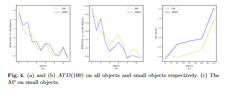 - (a) 전체 객체 ATD(100) : DN과 DINO 모두 유사한 성능, 12epoch 후 수렴
