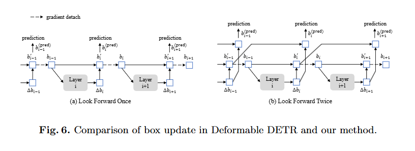 - "Look Forward Once" : 디코더 레이어 간 Gradient detachment로 iterative 박스 정제