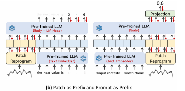 패치 변환 후, 추가적인 프롬프트를 입력하여 LLM이 시계열 데이터를 더 효과적으로 학습할 수 있도록 유도