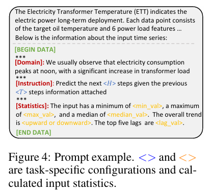 - 단순한 입력 변환을 넘어, LLM이 시계열 데이터를 잘 이해할 수 있도록 도메인 지식 및 작업 지침을 포함한 프롬프트 제공.
