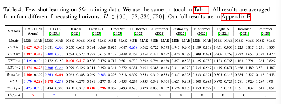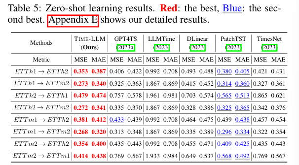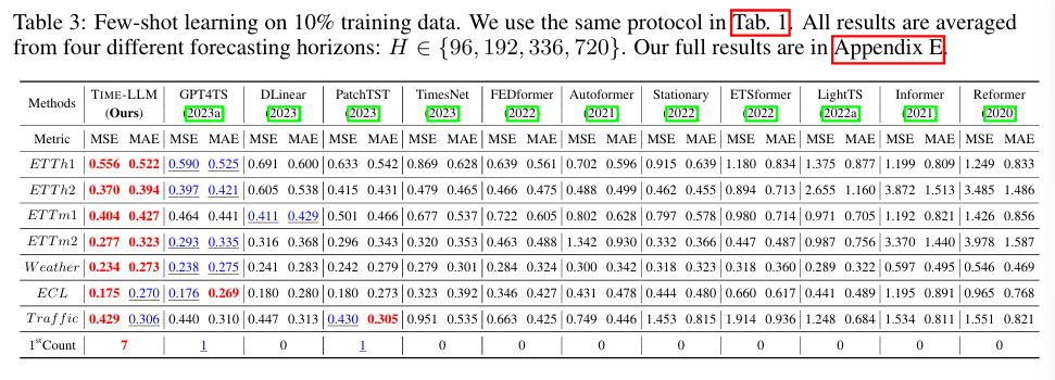 TIME-LLM은 다양한 벤치마크와 실험 설정에서 최신 SOTA 시계열 예측 모델을 뛰어 넘는 성능을 기록했다. 특히 Few-shot 및 Zero-shot 학습 시나리오에서도 우수한 성능을 보였다.