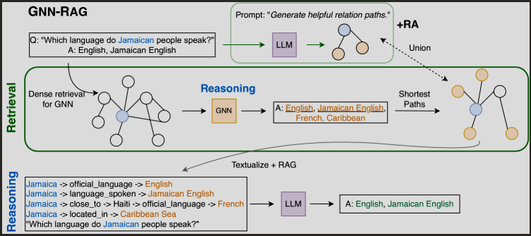 GNN이 KG(지식 그래프)에서 관련 정보를 검색하고, LLM이 이를 활용해 답을 생성한다.