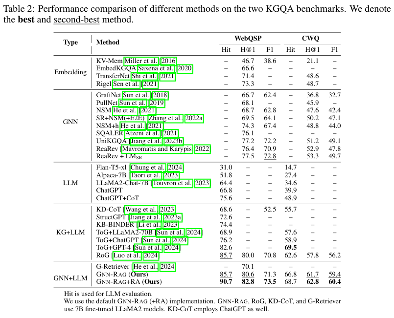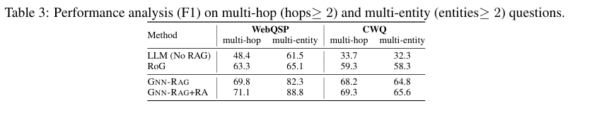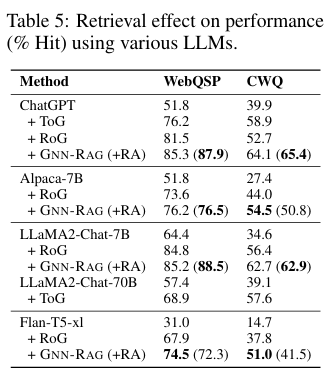 실험에서 GNN-RAG + RA 방식이 가장 높은 성능을 보임