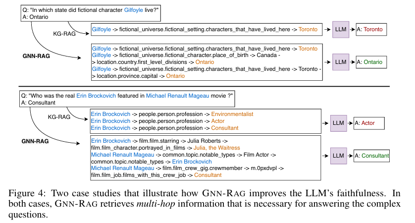 Figure 4. GNN-RAG가 LLM의 신뢰성(Faithfulness)을 어떻게 향상시키는지 보여주는 사례