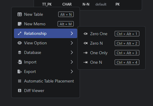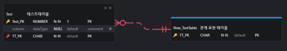 두 테이블을 간 관계는 마우스 우클릭 후, 관계에 맞는 선을 찾아 연결하면 된다.