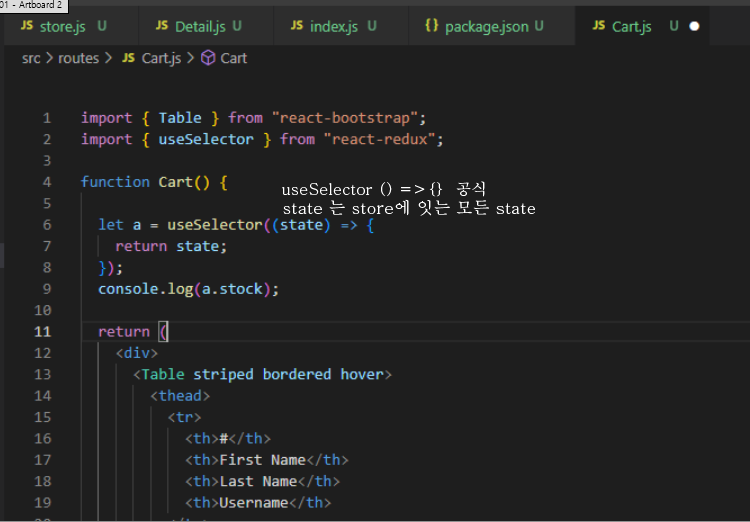 이것을 redux.store안에 보관하고 Cart페이지에서 데이터 바인딩을 해보자.