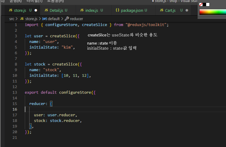 리덕스를 사용하면 상태값을 컴포넌트에 종속시키지 않고, 상태관리를 컴포넌트 바깥에서 관리할수있도록 하게된다. store.js 파일을 만들고 아래와 같은 코드를 작성한다. 이 파일이 state들을 보관하는 파일이다.