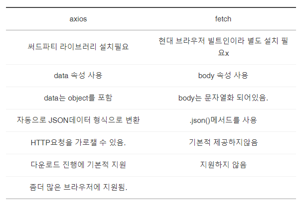 Fetch와 axios를 비교해보는 표는 아래에 참고.