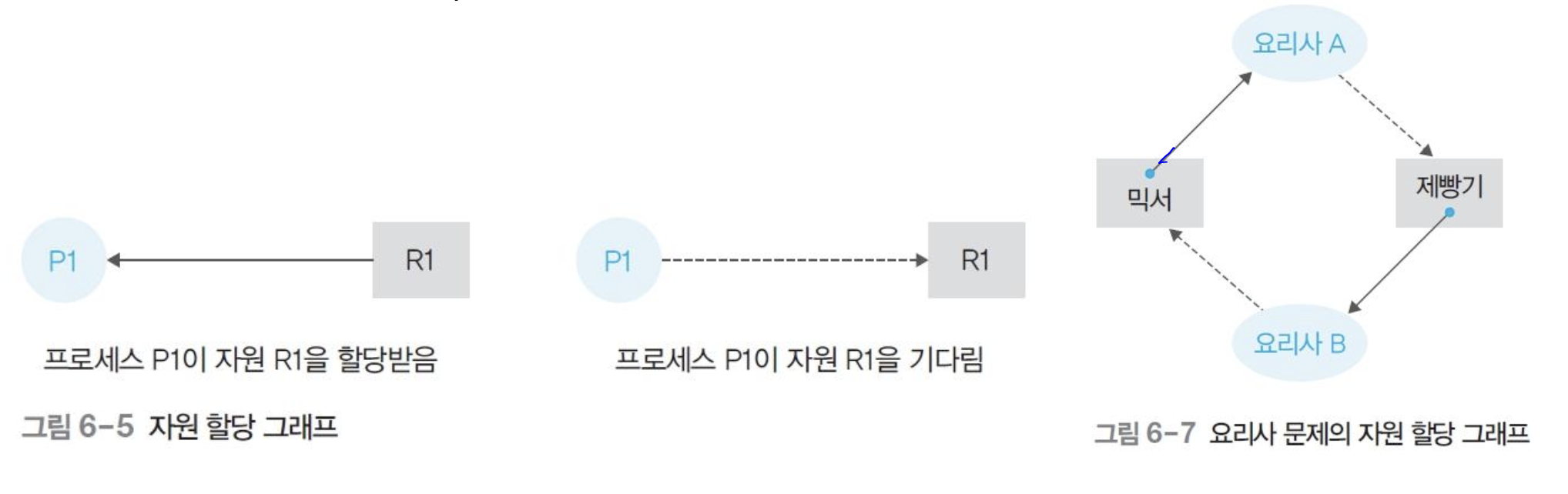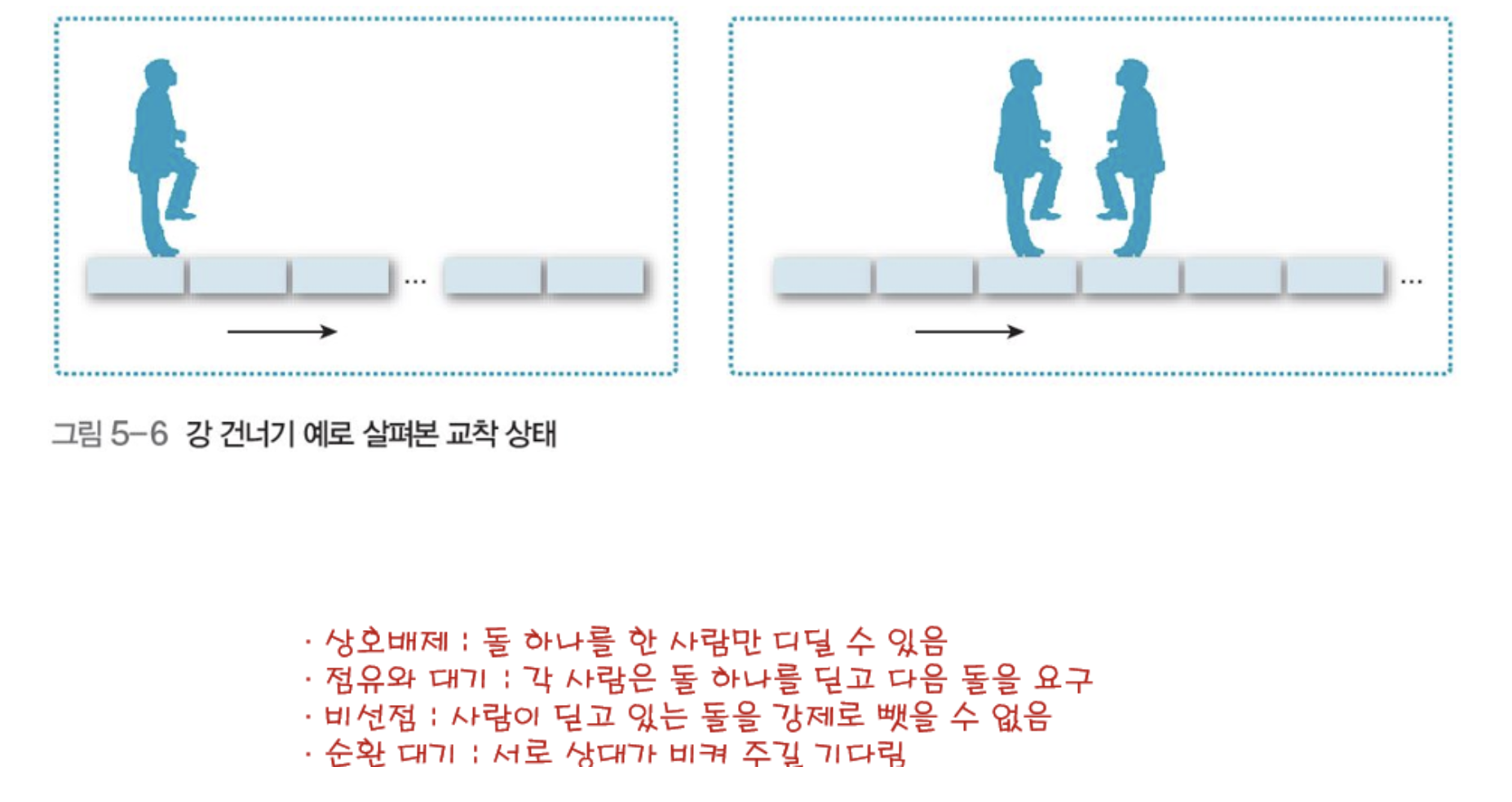 - 교착상태(deadlock): 여러 프로세스가 서로 자원을 점유한 채, 자연적으로 (알고리즘상 결함 없이도) 아무도 전진 못하는 상태