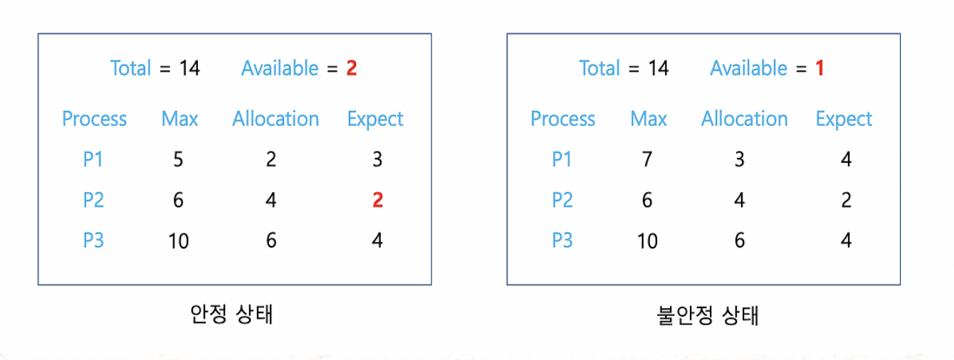 자원의 총수와 현재 할당된 자원의 수를 기준으로 시스템을 안정 상태와 불안정 상태로 나누고 시스템이 안정 상태를 유지하도록 자원을 할당한다.