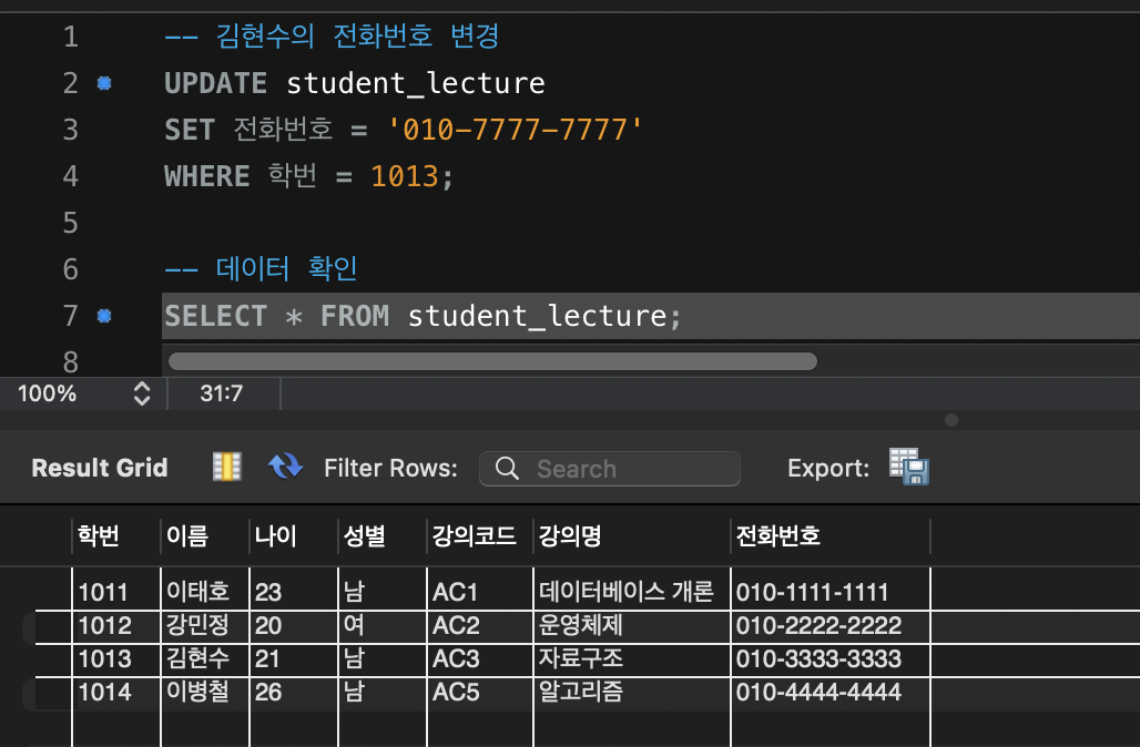 -- 김현수(자료구조 수강)의 전화번호만 수정
