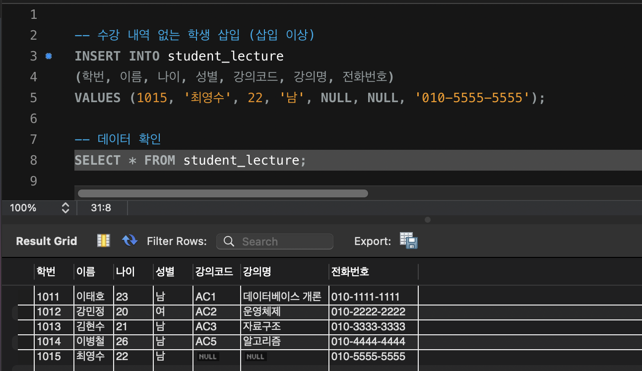 • 강의코드, 강의명에 값이 없으니 NULL을 넣을 수밖에 없음