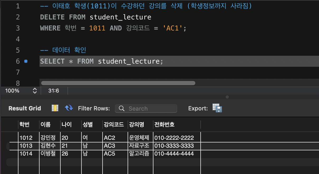 • 이태호(1011) 학생이 듣던 “데이터베이스 개론(AC1)” 강의를 더 이상 개설하지 않아 해당 행을 삭제