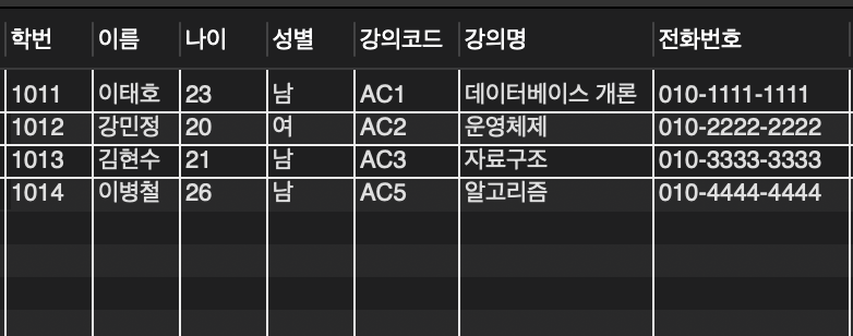 (학번, 이름, 나이, 성별, 강의코드, 강의명, 전화번호)