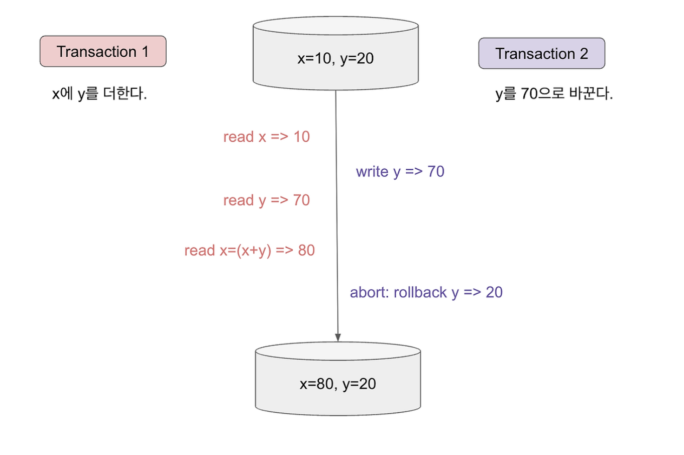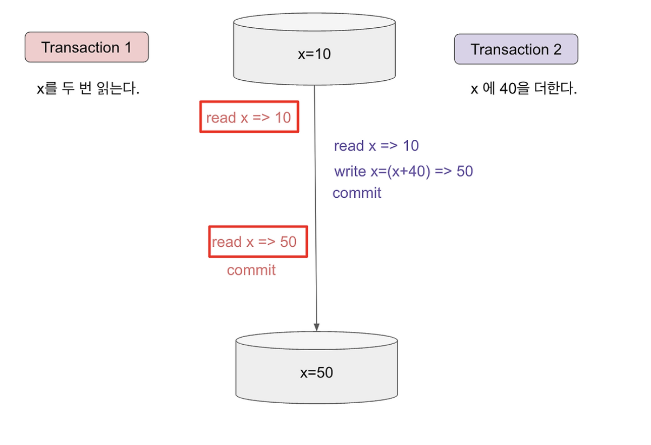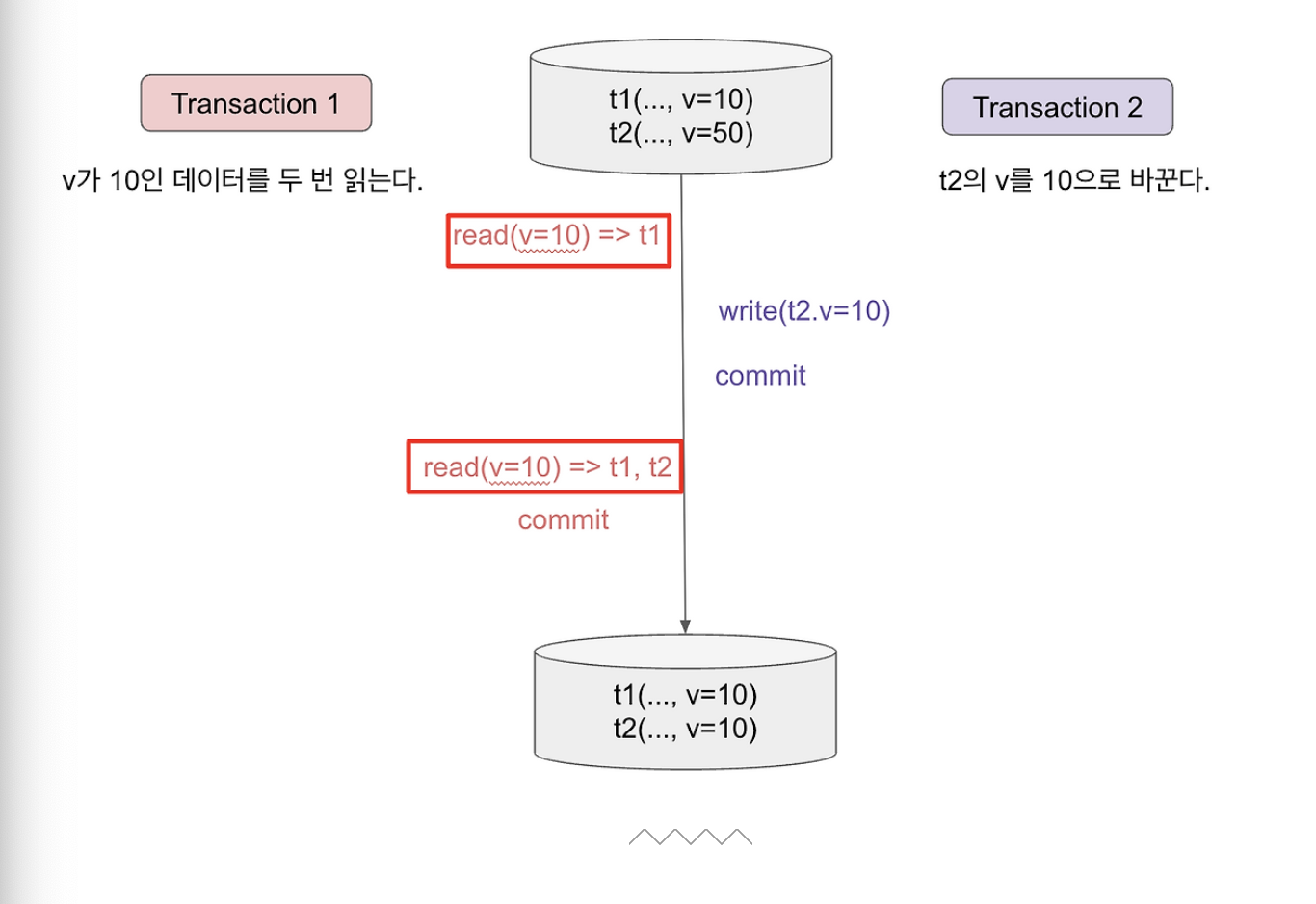 한 트랜잭션 내에서 읽은 값이 일관성 없이 달라질 수 있음.