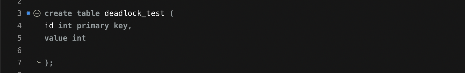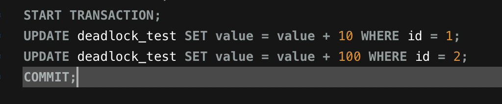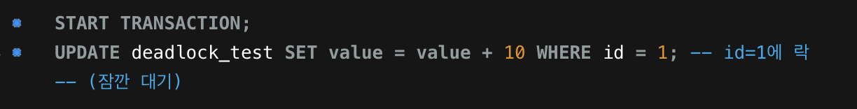 아래 쿼리는 MySQL 등에서 두 개의 세션을 이용해 직접 데드락 상황을 유도하는 기본 예시입니다.