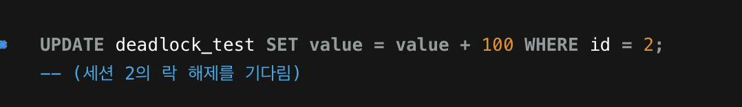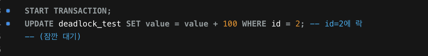 참고로 데드락 상황은 2개의 서로 다른 "세션"(=연결창, 터미널, 쿼리 실행창)에서 발생시켜야 합니다.