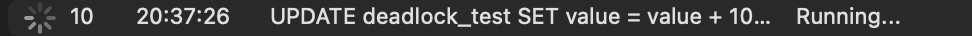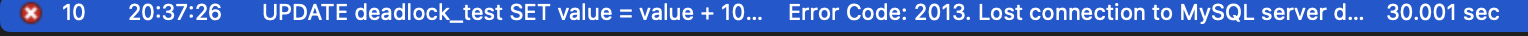 20:37:26 UPDATE deadlock_test SET value = value + 100 WHERE id = 2 Error Code: 2013. Lost connection to MySQL server during query 30.001 sec