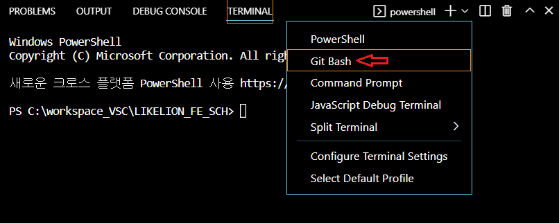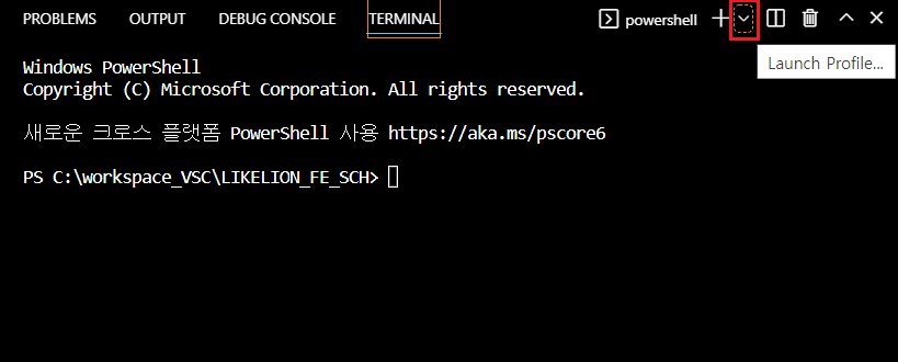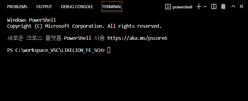 하단에 다음과 같은 터미널 창이 열린다. 현재 기본 설정인 powershell이 켜진 모습