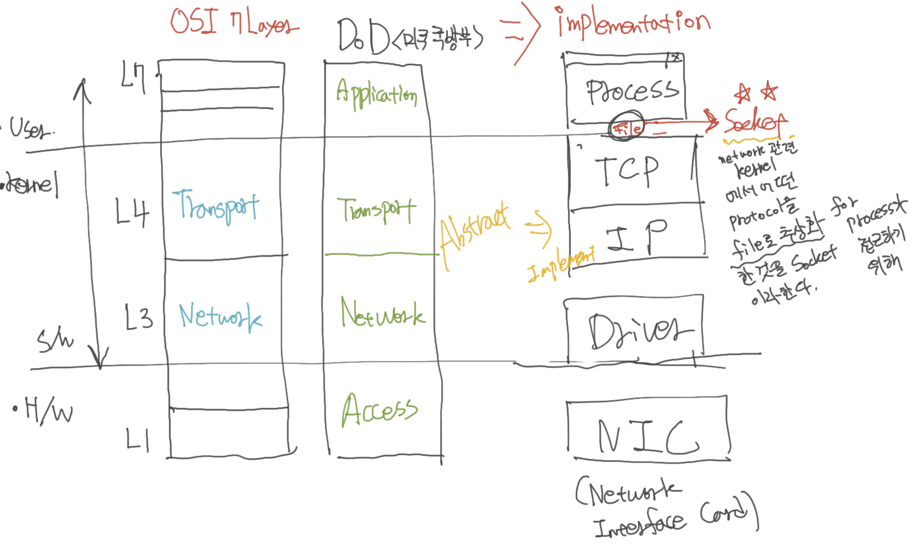 - 이를 구체화 한것이 TCP/IP 쪽으로 본다면 Process가 있고 kernel 단에서는 Transport/Network가 TCP/IP로 구현되어있으며 H/W 단에서는 NIC(Network Interface Card)라고 하는 것이 있고, 이에 접근하기위해 Kernel에서 Driver가 존재하여 이를 통해 H/W에 Access 하여 TCP/IP 기능을 수행할 수 있는 것이다.
