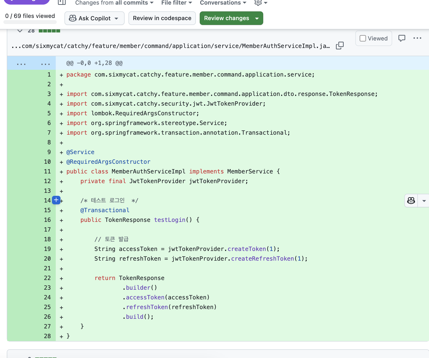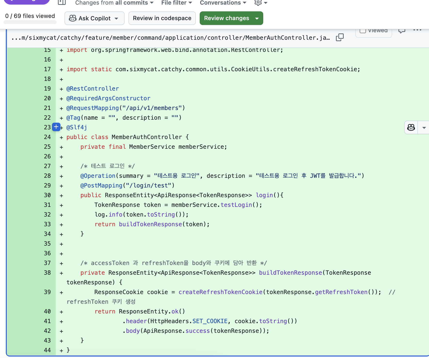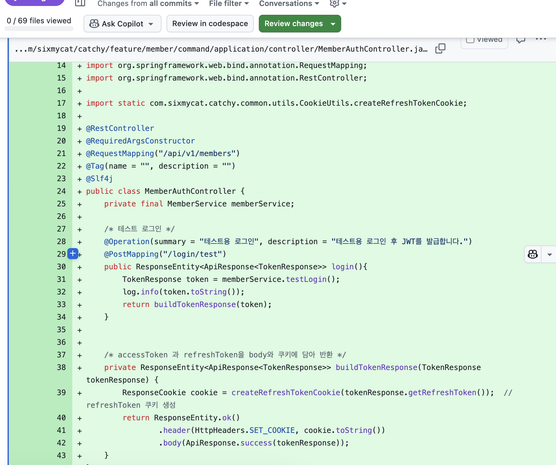 그래서 저는 빠르게 해당 기능만 구현하는 코드를 구현했고 추가적으로 로그인 시에 필요한 유효성 검사나 refreshToken을 Redis에서 관리하는 코드는 모두 빼고 accessToken과 refreshToken을 생성하고 refreshToken은 body에 넣고 refreshToken은 헤더에 넣어서 HttpOnly 쿠키에 저장하도록 하는 것만 구현해서 초기부터 로그인 했을 땡와 동일한 환경을 구축했고 userId가 필요한 api를 구현할 때 테스트 로그인을 사용해서 다른 팀원분들도 빠르게 api를 구현할 수 있으셔서 참 뿌듯했던 것 같습니다.