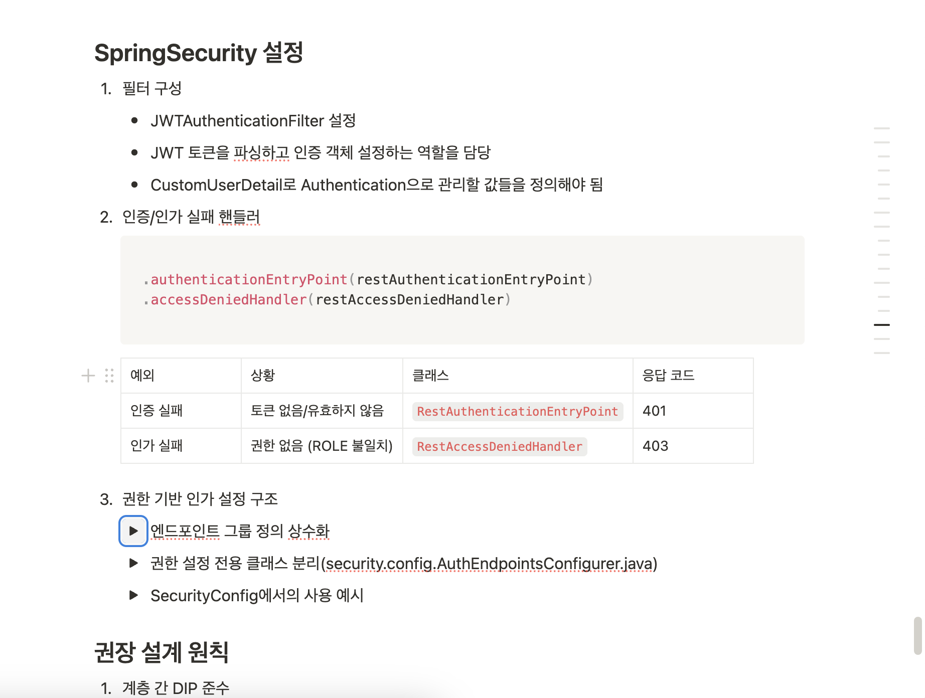 이를 통해 컨벤션을 설계해놓고 잘못 구현해놓으면 저 혼자만 실수하는 것이 아닌 모든 팀원들의 실책으로 이어져 큰 문제가 발생 할 수 있음을 이번 프로젝트에서 경험하게 되었습니다. 물론 저도 userId만 Authentication으로 관리하는 이유가 이번에는 role이 필요없다 보니 String 타입의 userId만 관리하면 될 것 같아서 변경을 한 것인데 변경을 했으면 컨벤션도 수정을 했어야 했는데 그러지 못해서 문제가 있었고 이번에는 작은 문제이지만 회사에선 큰 문제를 발생할 수도 있단 생각을 하게 되어 컨벤션 설계에서 끝나지 않고 업데이트 역시 중요하단 것을 이번 경험을 통해 알게 되었습니다.