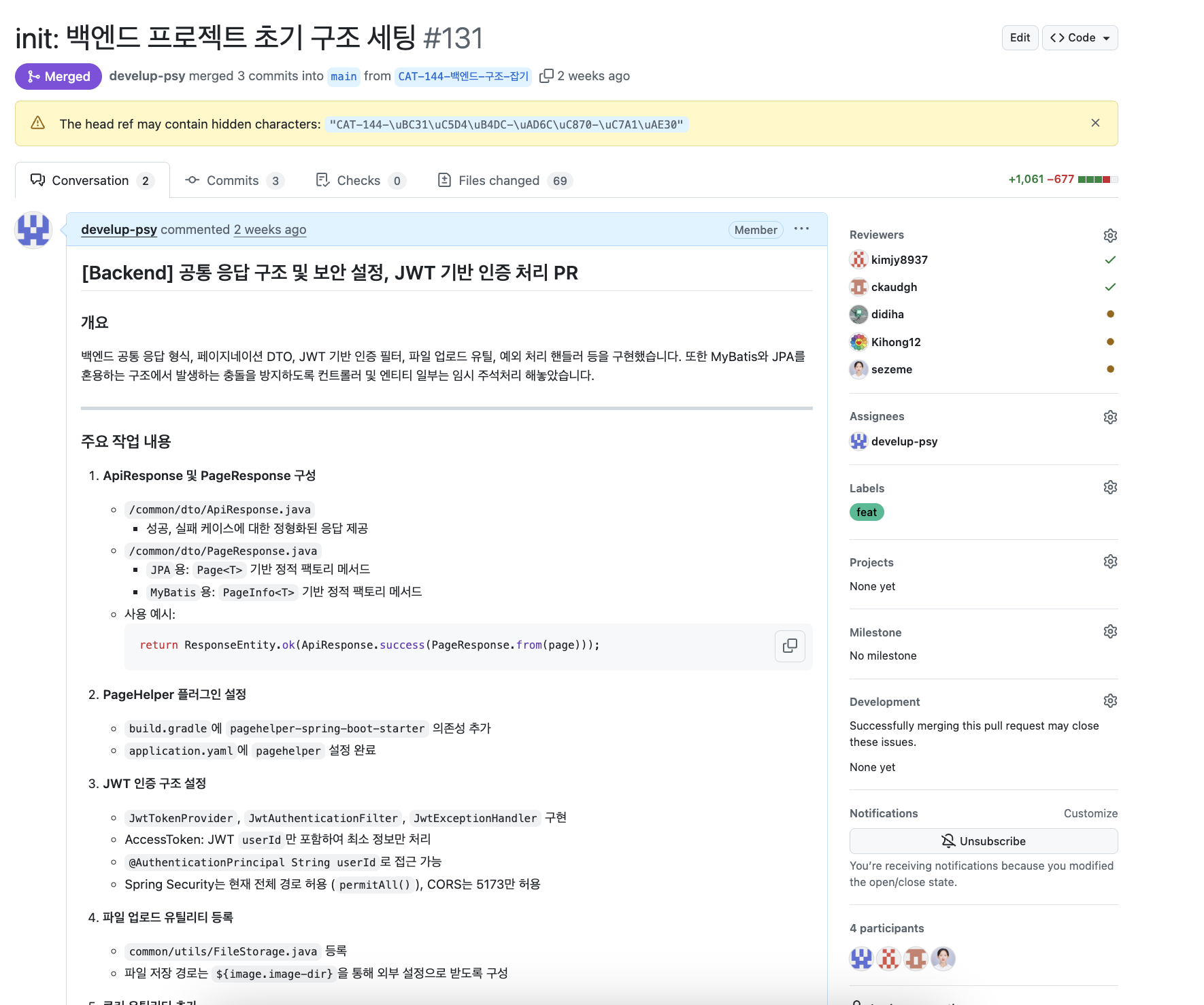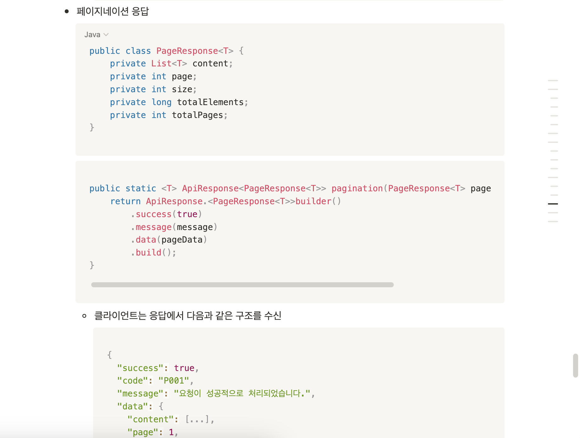그리고 페이지네이션의 경우에 수업에서 배운 방식이 아닌 PageResponse로 감싸서 PageHelper 라이브러리를 사용해서 페이지네이션을 처리해주는 것 역시 동일하게 구현해주셔서 통일성 있는 프로젝트를 진행한 것 같아 컨벤션을 정리해야 하는 이유에 대해 다시 한번 중요성을 인식할 수 있었습니다.