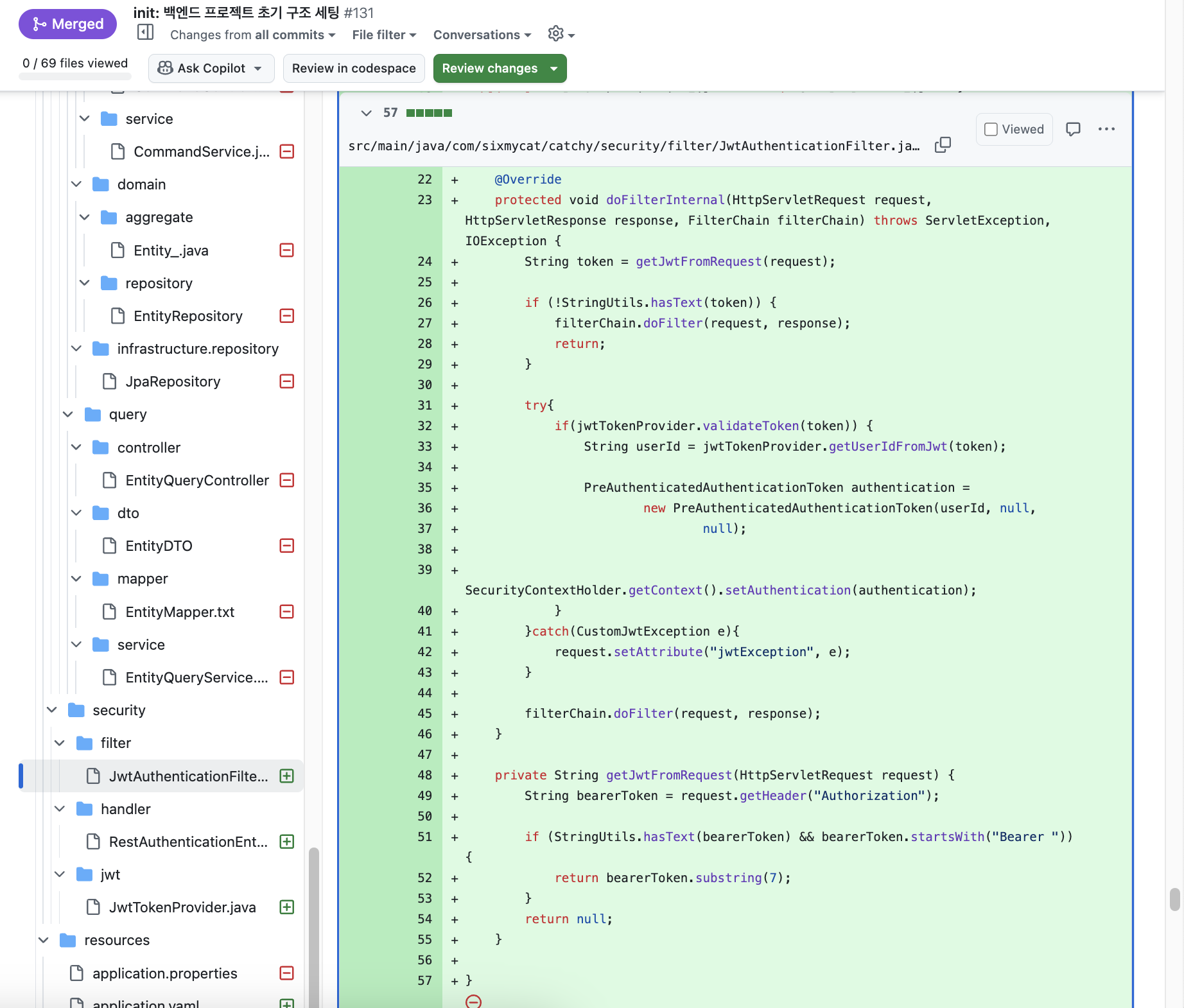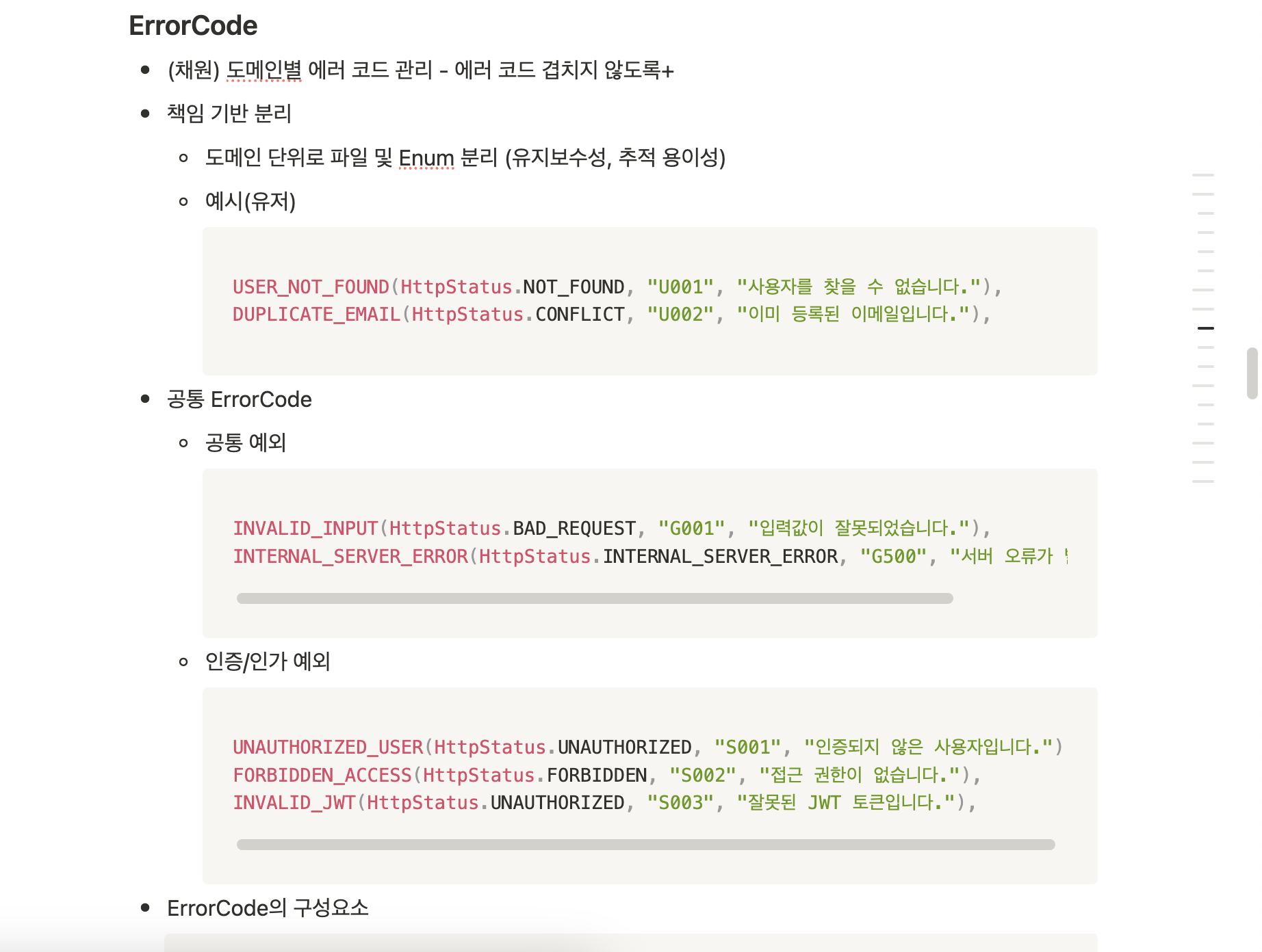 ErrorCode도 이전 프로젝트에서 하나의 파일로 관리하다보니 매번 병합시 사라지는 일이 발생하여 도메인별로 에러코드 Enum을 관리하자는 안건을 냈지만 이번 팀원분들은 깃 관리에 자신있다고 하셔서 하나의 파일로 관리하는 것으로 합의를 봤고 다행히도 모두가 깃 관리를 잘해주셔서 하나의 파일로 관리해도 문제가 없었습니다.