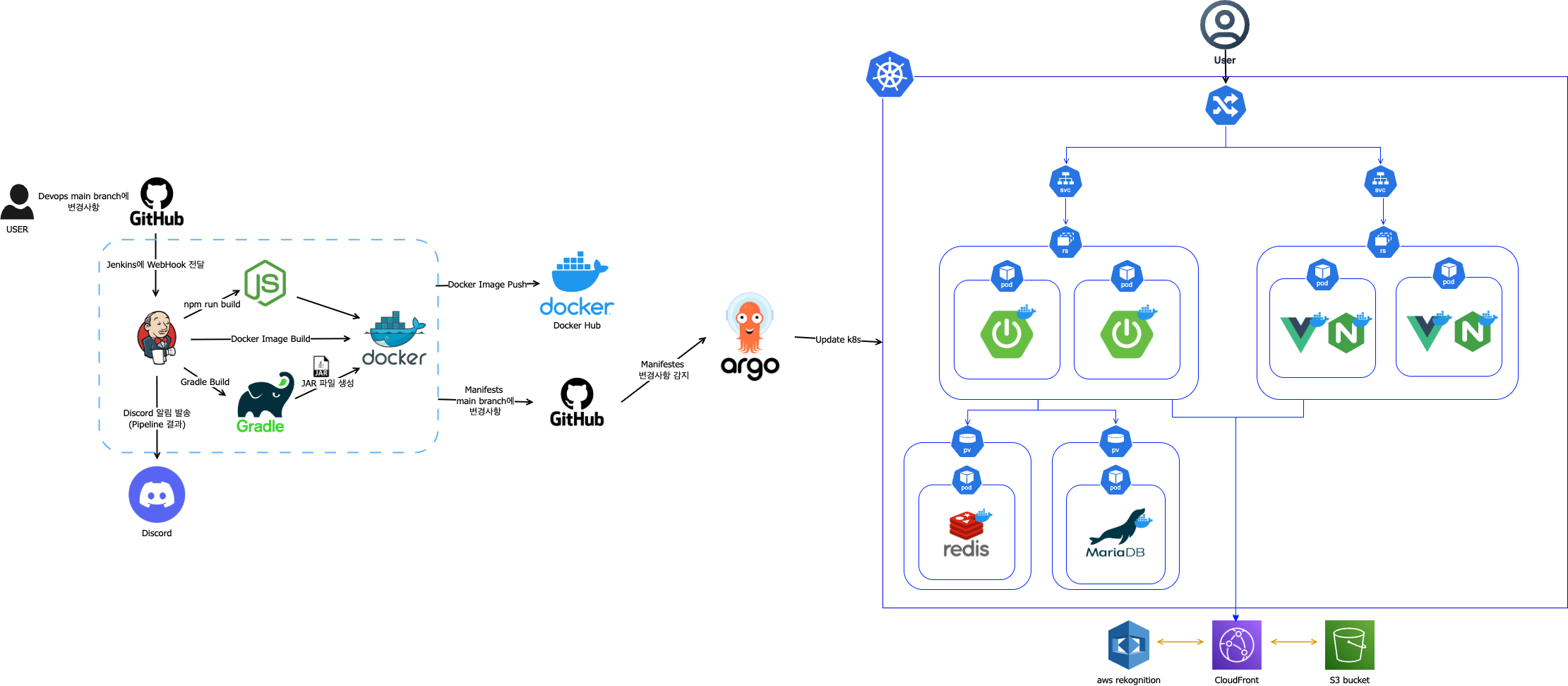 이번 프로젝트에선 저는 CI/CD 영역을 다루면서 Docker, Kubernetes, Ingress, Nginx, ArgoCD, Jenkins, GitHub Webhook, Discord Webhook, ELK 스택, Prometheus, Grafana, Spring Actuator 등 실로 다양한 DevOps 도구들을 한꺼번에 접하고 연동하는 경험을 했습니다.