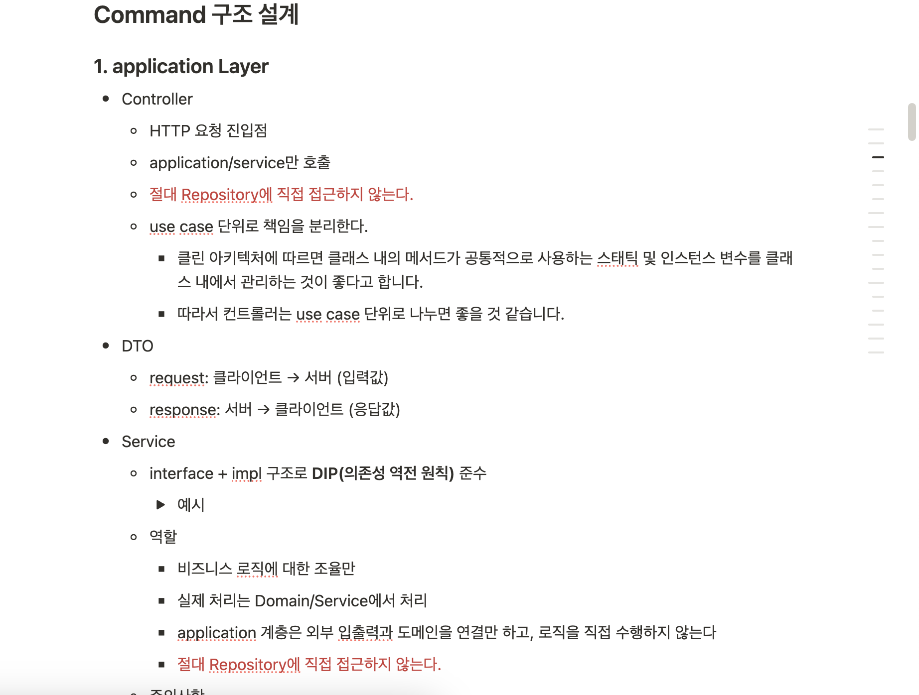 위의 링크로 이동하여 확인해보시면 아시겠지만 각각의 레이어에서의 역할이나 해야할 일들을 정리하였고 구현체와 인터페이스의 구분에 대해서도 정리하긴 했는데 그냥 이렇게 막연하게 정리하면 보시는 분들도 있으시고 안보시는 분들도 계신 것 같아서 다음에는 특히 필수적으로 확인을 했으면 하는 것들은 따로 요약용 버전도 만들어서 제공해야 할 것 같단 생각을 하게 되었습니다.