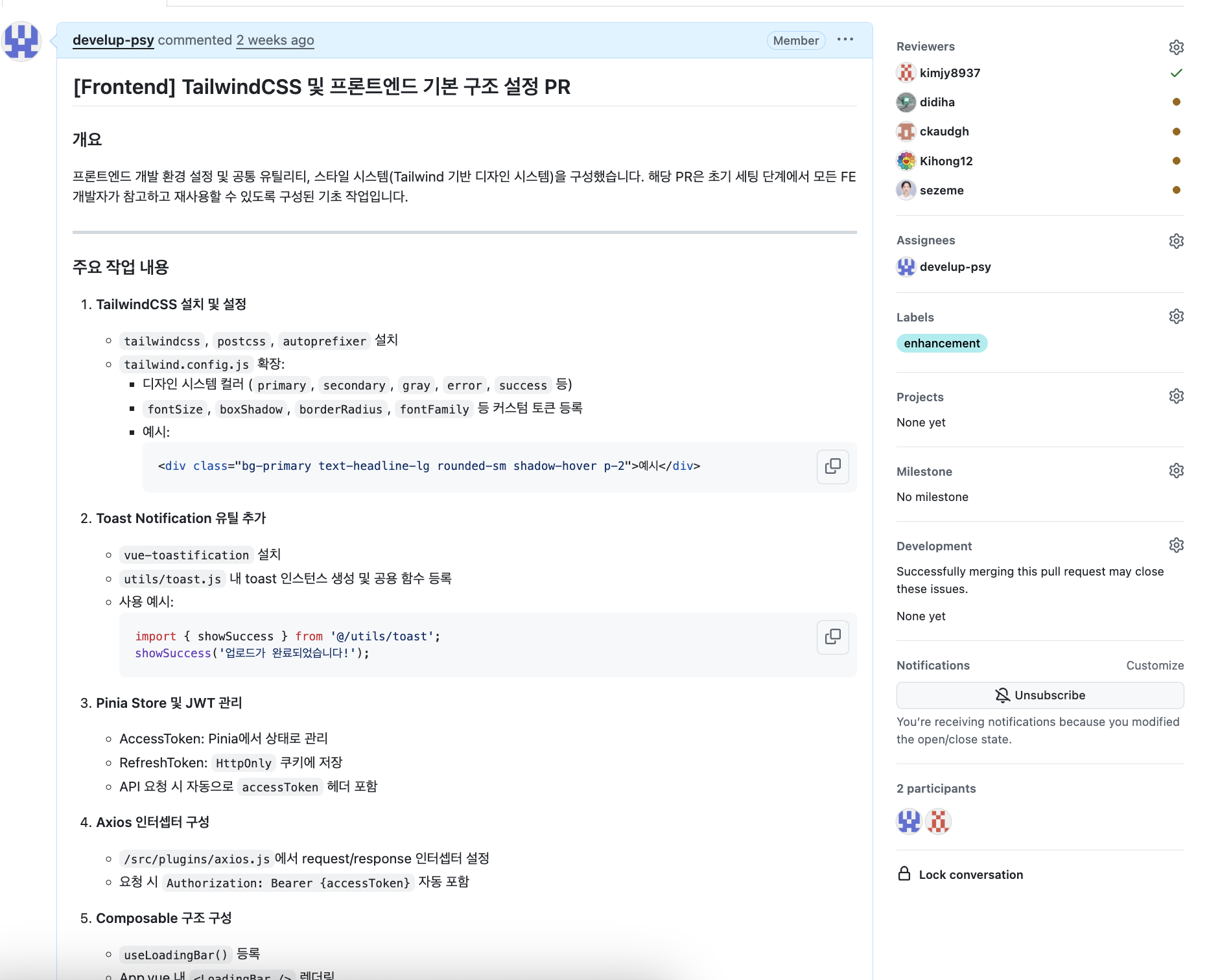 프론트엔드 프로젝트 세팅에 대한 PR역시 자세하게 작성하기 위해 노력했고 이전 프로젝트에서 TaiwlindCSS를 사용해본 팀원분들이 많으셨고 클래스 기반의 스타일 적용 방식의 편의성을 모두 좋게 생각하셔서 tailwindCSS를 적용하기로 했고 다른 팀원분들의 경우에 tailwind.config.js 파일로 스타일 시스템을 확장 할 수 있다는 것을 모르셨다고 하셔서 피그마에서 적용한 스타일 시스템과 동일하게 tailwindCSS에서 구현에서 사용할 수 있는 시스템을 확장했습니다.