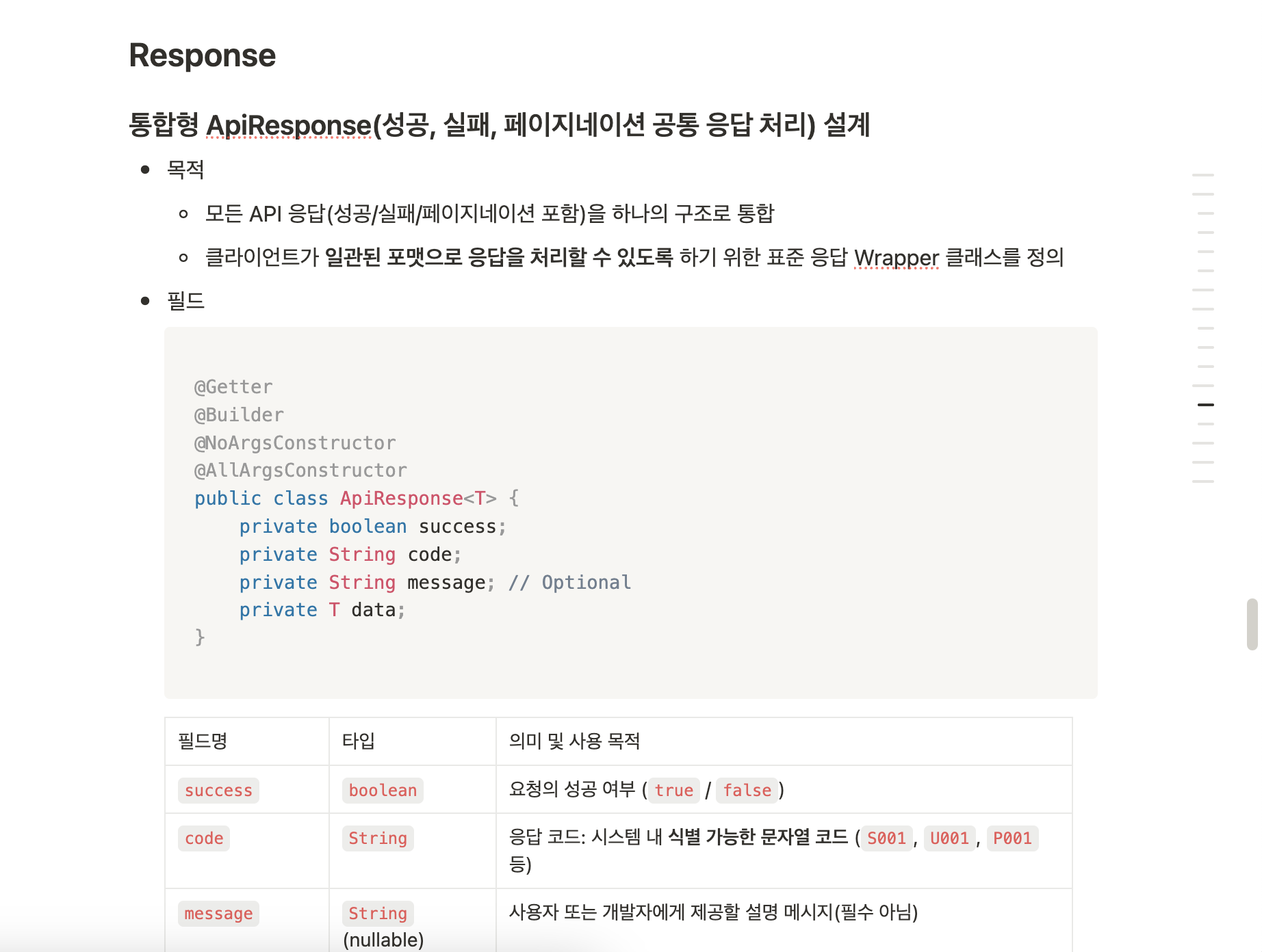 그리고 통합 ApiResponse도 컨벤션을 정리하여 공유하다보니 내가 직접 구현한 API가 아니여도 예상 가능한 Response를 받을 수 있어 다른 사람들이 만든 API를 사용하기 매우 쉬었고 코드 리뷰하는 것 역시 어려움이 없었던 것 같습니다.