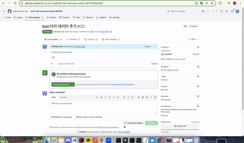 이번 프로젝트에서 가장 중요시 한 것이 효율적인 개발 환경이었기 때문에 서로 코드 개발에 대한 내용은 모두 PR로 공유하는 것으로 하기로 했고 남들의 코드 리뷰 시간을 최소한 줄이기 위해 PR을 최대한 구체적으로 잘 작성하기로 했고 위의 예시처럼 최대한 구체적으로 코드나 예시 위주로 작성하는데 중점을 두어 작성했습니다.