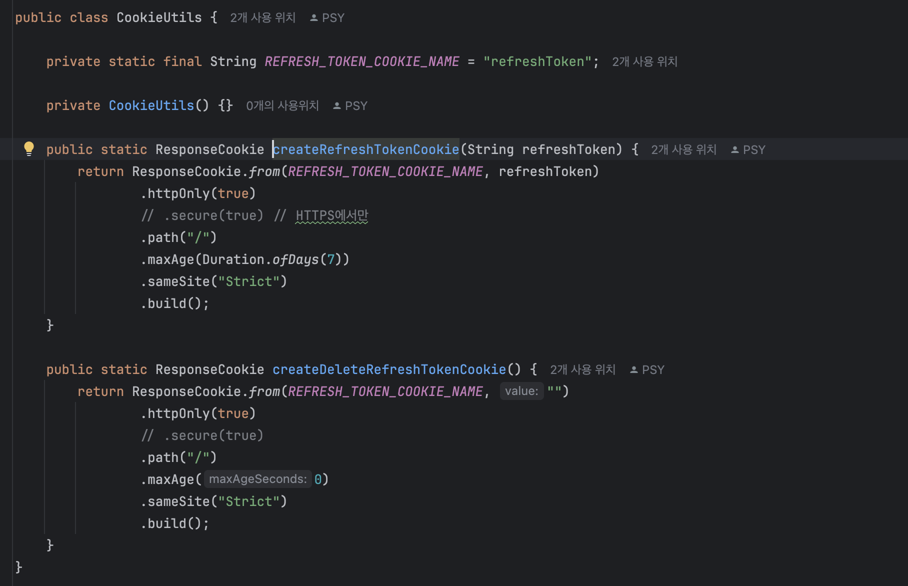 쿠키 설정에 대한 소스코드들은 유틸 클래스로 관리하도록 구현했습니다.