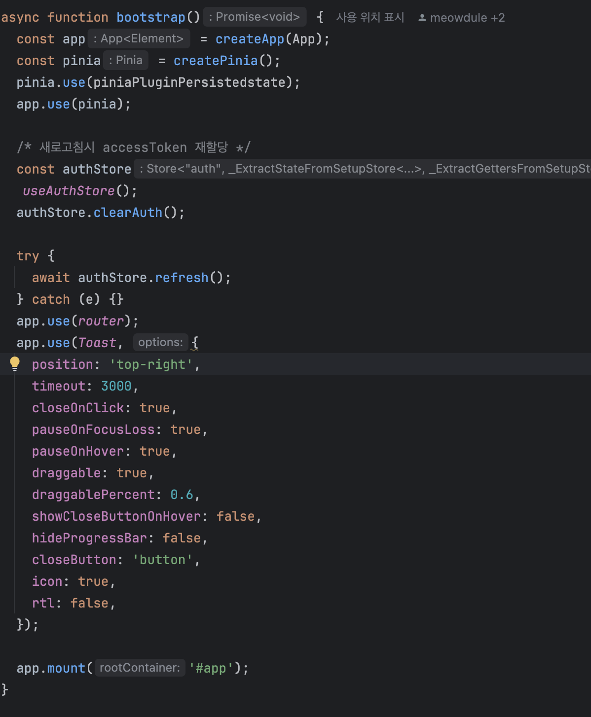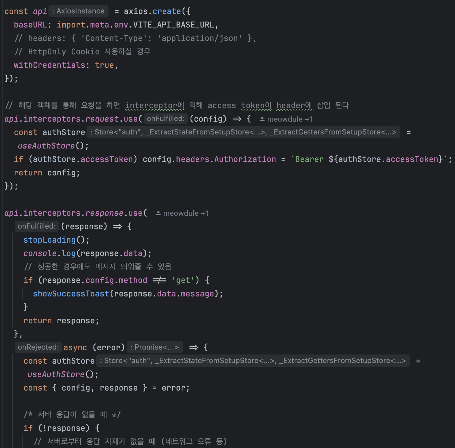그리고 요청시에도 Pinia 전역 상태에서 관리하는 JWT 토큰을 Header의 Authorization에 넣어 보낼 수 있도록 요청 시 인터셉터를 설정하기도 했습니다.