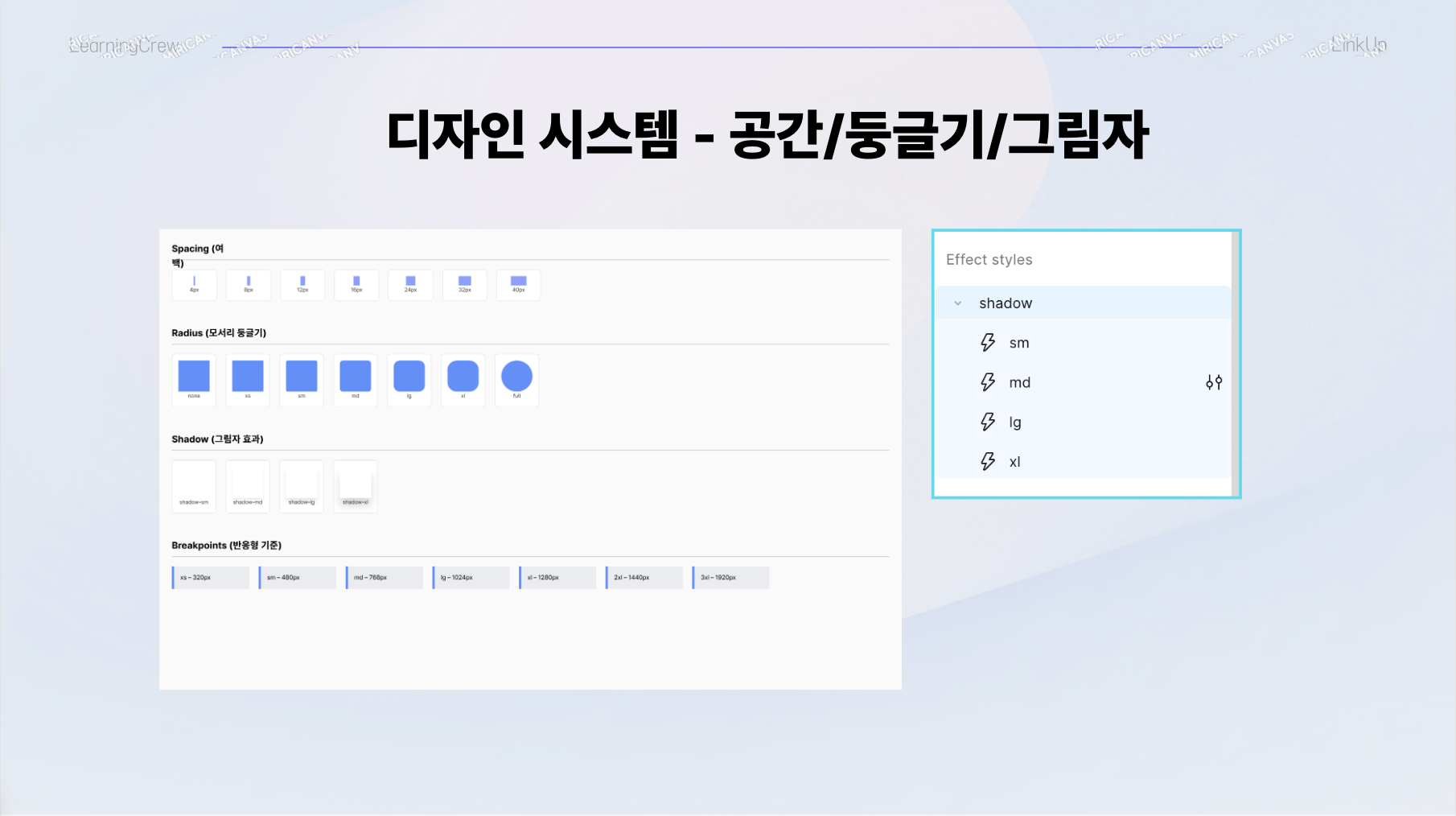 또한 디자인을 각자 진행하다보니 서로 사용하는 색이 다르고 요소와 요소간의 여백이나 사용하는 폰트나 둥글기나 그림자 같은것이 다르다는 것을 깨닫고 이러한 디자인과 관련된 컨벤션을 정리할 필요성을 깨닫고 팀원분들이 보고 참고할 수 있도록 디자인 시스템을 설계했고 그 결과물은 다음과 같습니다. 피그마 스타일에도 적용하여 페이지 제작시에 필요한 색상이나 폰트들을 사용할 수 있도록 설정도 하였습니다.